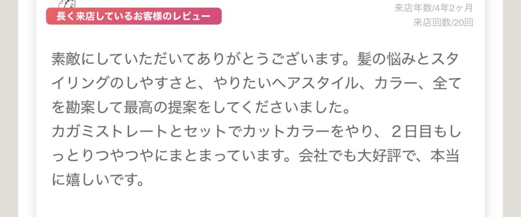 長年通ってくださっているお客様から、こんな素敵な口コミをいただきました。