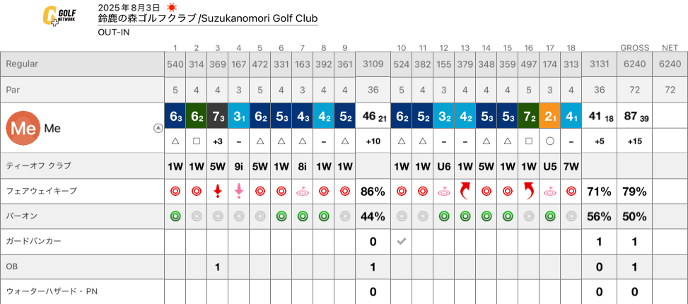 2025年8月3日、鈴鹿の森ゴルフクラブでのラウンド結果。