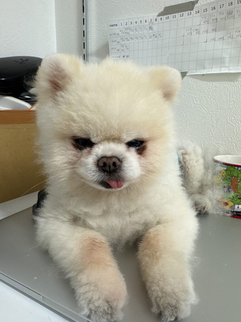 最近の空くんは、なかなか美容院に行けず、もけもけでふて寝モード。 スタッフは掃除や準備に大忙しだけど、空くんだけは完全に「今日は働かん」スタイル。