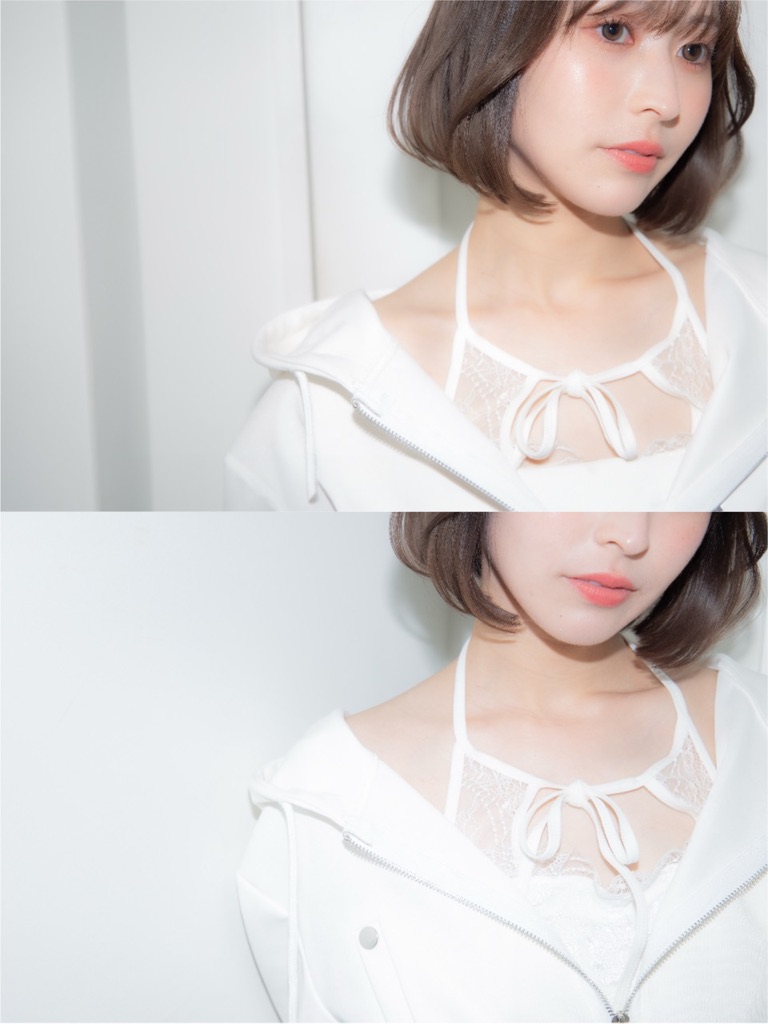 頬のラインで切りそろえたシルエットは、小顔効果も抜群。