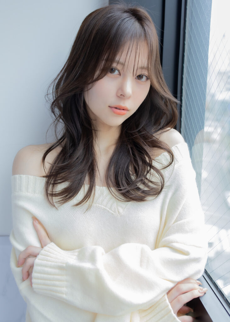 春にぴったりの軽やかさと柔らかさを感じる韓国レイヤースタイル。 顔まわりは頬に沿わせるようにレイヤーを入れて、小顔効果をしっかり引き出しています。