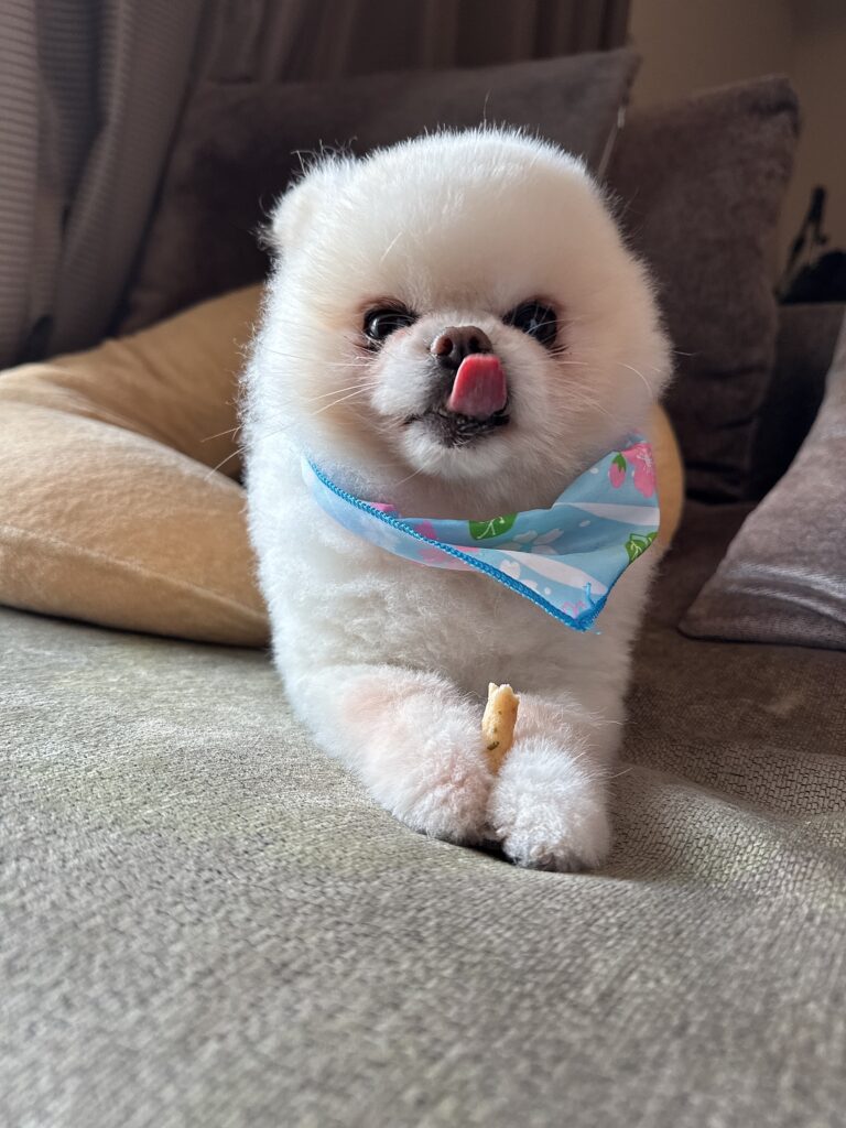 首元には春らしいバンダナをつけてもらって、おやつタイムもご機嫌です